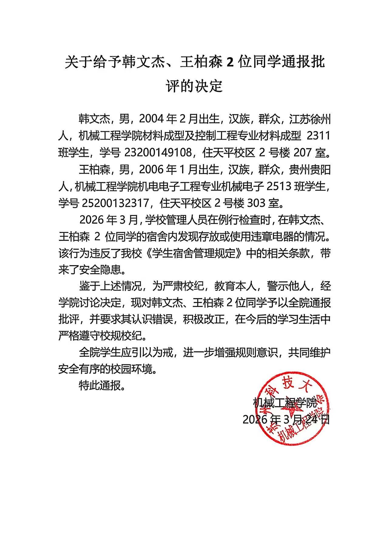 关于给予韩文杰、王柏森2位同学通报批评的决定