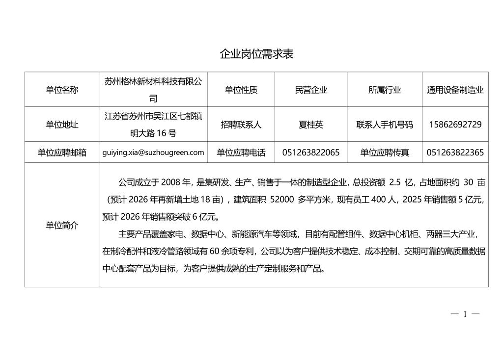 苏州格林新材料科技有限公司招聘